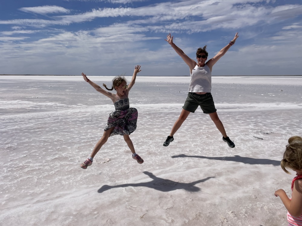 You know you have arrived when the huge rusted TYRRELL letters appear on the edge of the lake. We tumbled out of the car, stretched stiff legs and immediately turned it into a mini photo shoot. The girls clambered over the letters, Ali did the classic arms-wide “look at this place” pose, and behind them the salt lake stretched off into the distance.