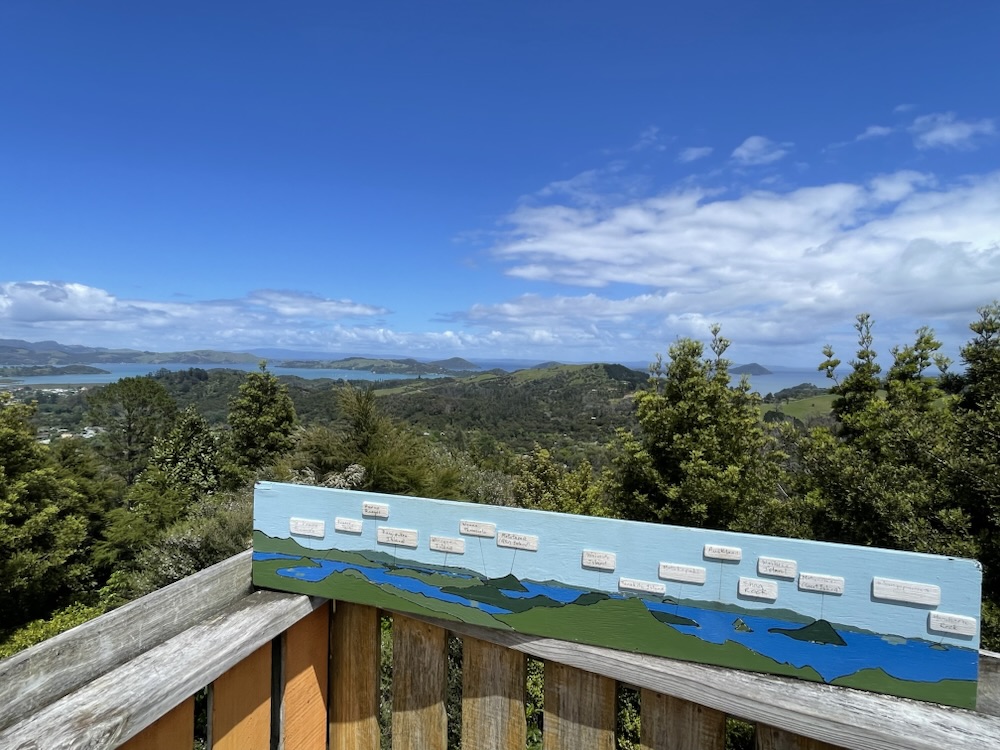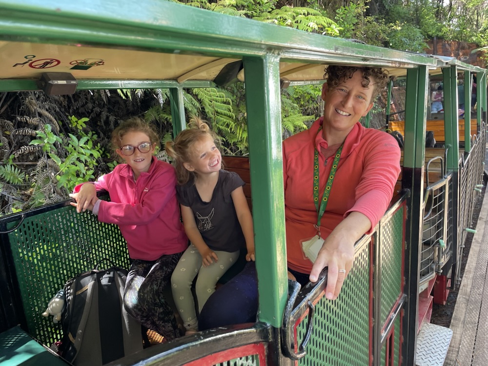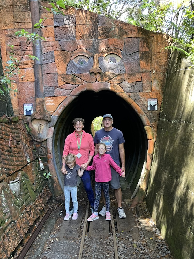 The girls loved it. Georgia hopped on like she owned the line, and Dotty had that nervous look. We wound through clay artwork, tunnels shaped like faces, bridges barely wider than the tracks and finally reached the Eyeful Tower lookout. The view stretched all the way across the peninsula, green hills folding into blue bays like postcards overlapping each other.