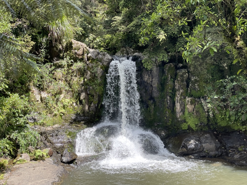 The bush was thick, cool, and humming, and then out of nowhere the waterfall roared into view not massive, but powerful, pouring over dark rock into a deep green pool.,Ali took in the calm, and we just soaked up another pocket of this endless New Zealand magic. The kind you donβt plan; it just finds you.