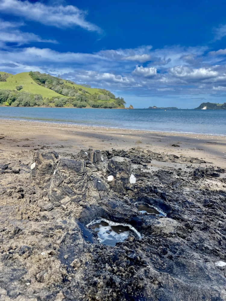 The weather had finally cracked open blue sky, soft light, and the bay turning turquoise. The girls ran straight to the black-sand patches (which up close look like someone spilled charcoal and glitter together). They built one of the most chaotic sandcastles of the trip, a mix of sludge, shells, and determination. It lookedβ¦ well, βtexturedβ, but proud of it.