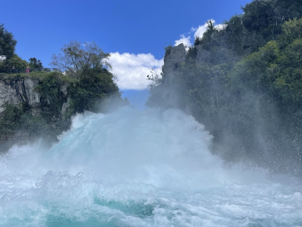 We headed straight to the jet boat experience, blasting back up the river to the base of Huka Falls the same waterfall we admired from above yesterday. The difference between “looking at it” and “being fired at it in a boat doing 360-degree spins” is night and day.