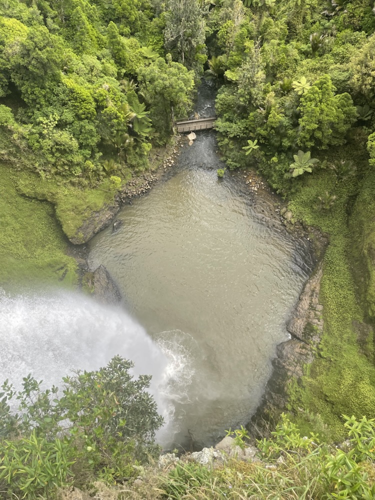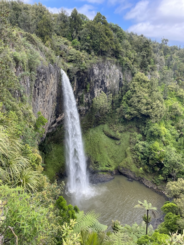 The walk down takes you through lush bush, little lookout platforms, and that classic New Zealand “Where even am I right now?” vibe. Then you reach the base and boom. A perfect white ribbon of water crashing into a circular pool wrapped in mossy cliffs and volcanic rock layers.