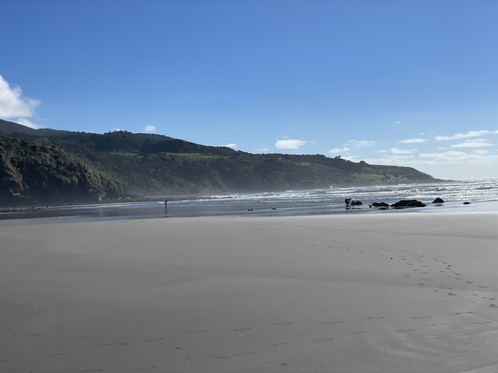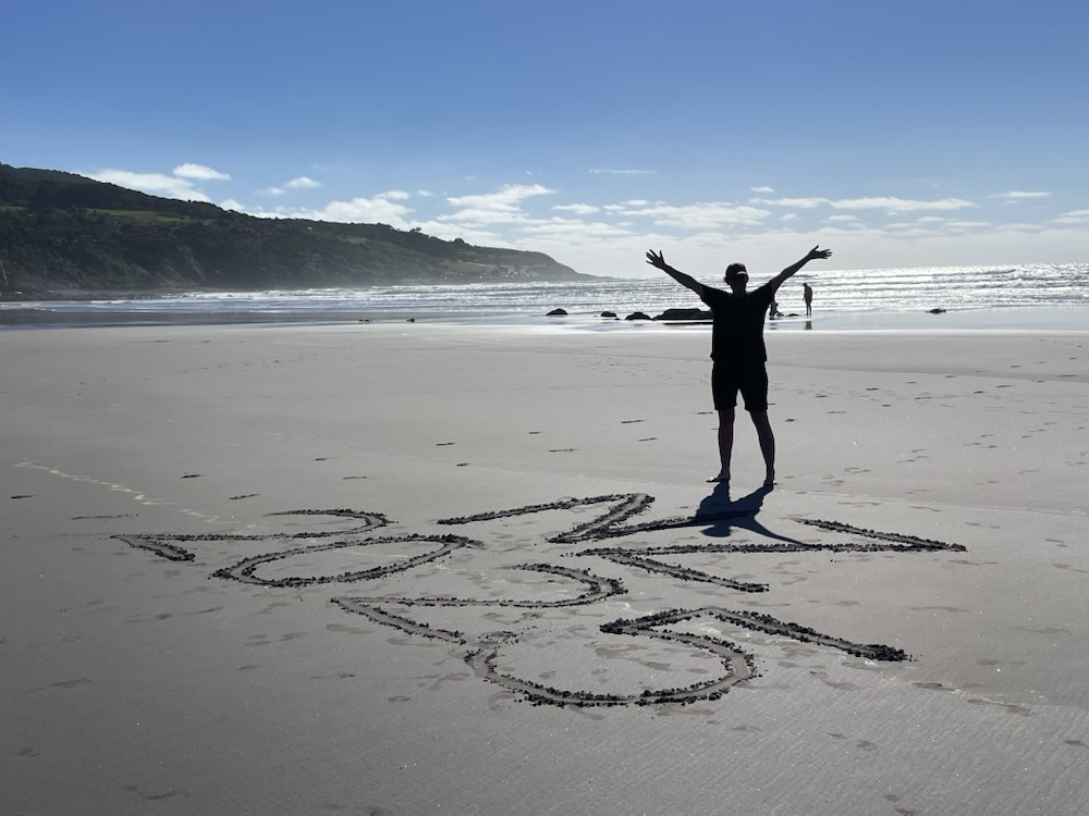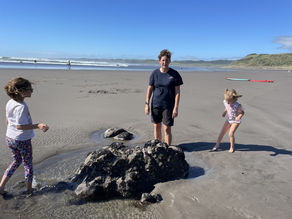 The girls found a rock covered in barnacles and turned it into a whole ecosystem drama. Ali wandered barefoot, loving the open space and warm air. And I stood in the middle of the beach and Ali carved “NZ 2025” into the sand like a giant kid claiming the coastline it was a mark to the end of our NZ adventures.