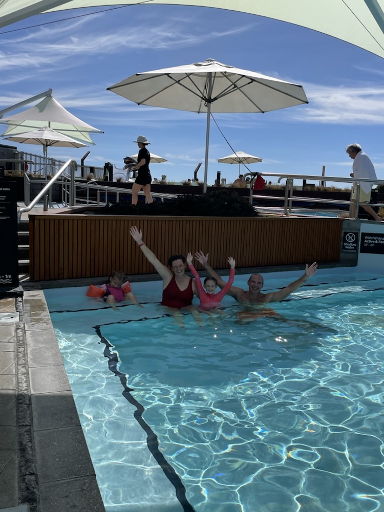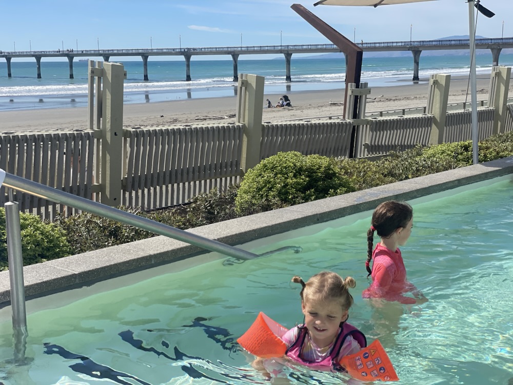 We started the day at the council run He Puna Taimoana Thermal Pools in South Brighton. Set just behind the dunes, these steaming saltwater pools overlook the Pacific, and under the late spring sun it felt like pure magic. Georgia and Dotty bounced between the family pool and the hotter corner pools, giggling.