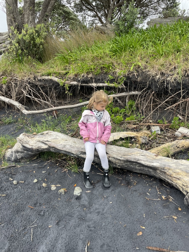 Dotty immediately claimed a driftwood log throne, sitting in her wellies and quietly lining up stones in front of her. Behind her, the dunes and banks show exposed roots and layers of dark soil where storms have bitten into the land, so you get this lovely contrast: wild, messy nature behind, calm silver water in front.